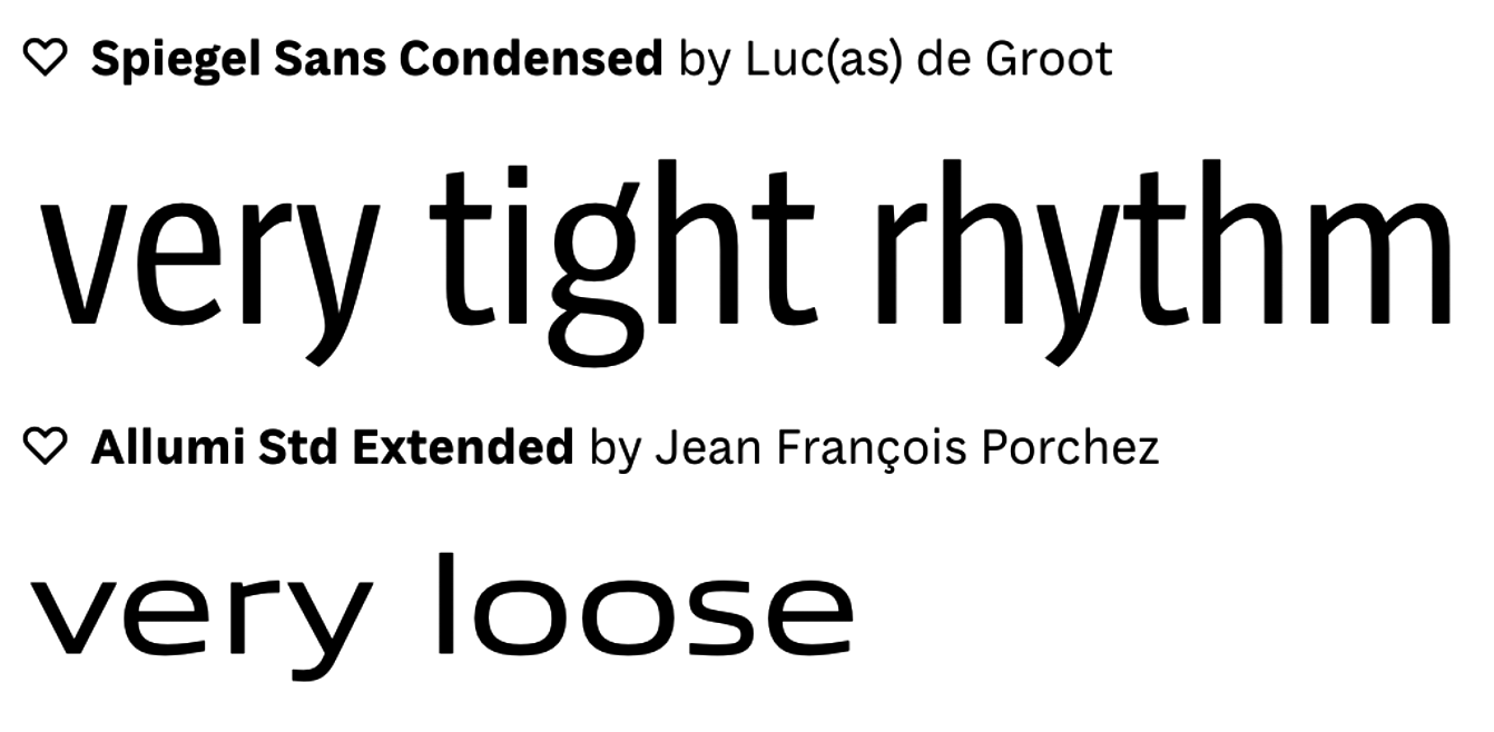 The pattern created by the repetition of vertical strokes; for example, condensed typefaces have a tight rhythm. Read more.